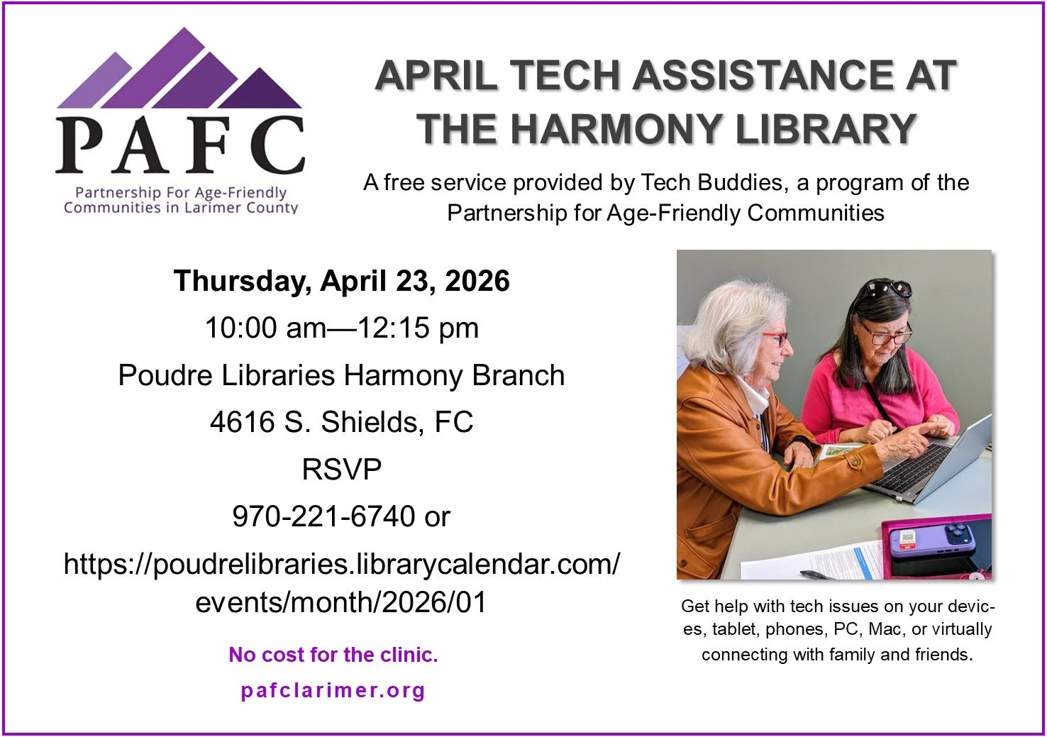 Back to All Events Tech Buddy Clinic Thursday, April 23, 2026 10:00 AM 12:15 PM Harmonay Library 4616 South Shields Street Fort Collins, CO, 80526 United States (map) Google Calendar ICS
