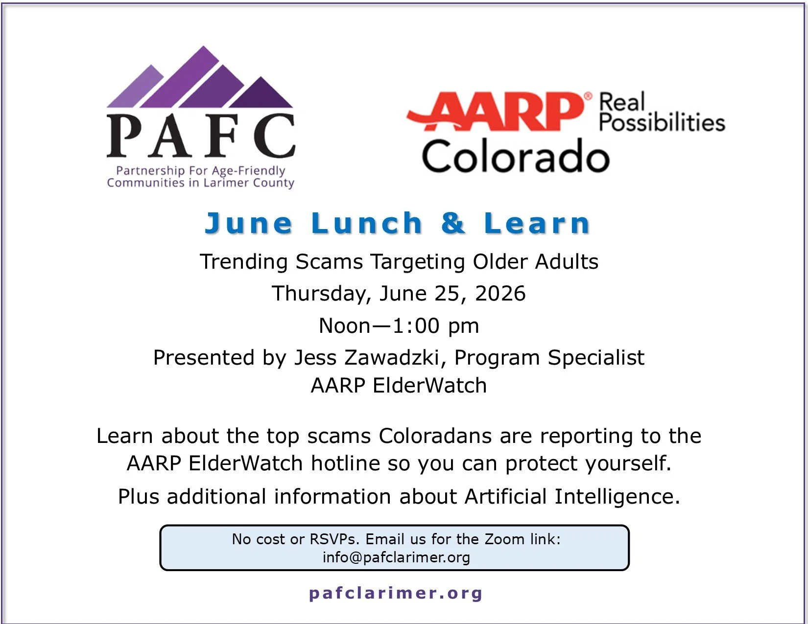 Lunch & Learn: Trending Scams Targeting Older Adults Thursday, June 25, 2026 12:00 PM 1:00 PM Google Calendar ICS